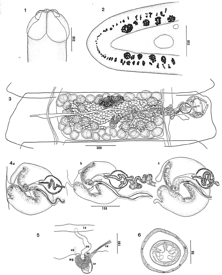 FIGS. 1-6. Tetrabothrius shinn; sp. nov. Fig. 1. Scolex. Fig. 2. Distribution of longitudinal muscle bundles in antiporal portion of a mature proglottid, transverse section. Fig. 3. Mature proglottid, dorsal view. Fig. 4. Detail of genital atrium showing male and female duels, and cirrus sac as viewed from the anterior in transverse section. Note change in length of male canal in relation to maturity in a single specimen: (a) early mature; (b) mature; also showing detail of vaginal seminal receptacle; (c) postmature. Fig. 5. Detail of female genital ducts, dorsal view, showing vagina (va), inner seminal receptacle (ST), oviduct (ov) , Mehlis' gland (mg) . vitelline duct (vel). ascending uterine duct (au), and transverse utenne stem (tu). Fig. 6. Egg. showing inner granular membrane, hyaline embryophore, and hexacanth embryo. All scale bars are in micrometres.