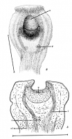 Plate I, Fig. 2 - Biacetabulum infrequens, scolex. Fig. 3 - Biacetabulum infrequens, frontal section through acetabular sucker. Explanation of Plates: a - acetabular sucker, e - excretory canals, g - ... MorePlate I, Fig. 2 - Biacetabulum infrequens, scolex. Fig. 3 - Biacetabulum infrequens, frontal section through acetabular sucker. Explanation of Plates: a - acetabular sucker, e - excretory canals, g - ganglionic mass, i - inner longitudinal cuticular muscle, olm - outer longitudinal muscle. The lines in the figures have the following values: 0.5mm. |