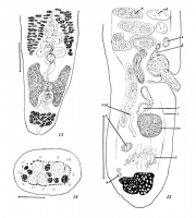 Plate II, Fig. 13. - Biacetabulum infrequens, toto, reproductive systems. Fig. 14. - Biacetabulum infrequens, cross section through testes. Fig. 15. - Biacetabulum infrequens, sagittal section through... MorePlate II, Fig. 13. - Biacetabulum infrequens, toto, reproductive systems. Fig. 14. - Biacetabulum infrequens, cross section through testes. Fig. 15. - Biacetabulum infrequens, sagittal section through reproductive systems. Explanation of Plates: d - ductus ejaculatoris, i - inner longitudinal cuticular muscle, om - ovarian commissure, ot - oötype, r - external receptaculum seminis, s - seminal vesicle, u - uterus, vd - vas deferens. The lines in the figures have the following values: Fig. 13. & 15. = 0.5mm, Fig. 14 = 0.2mm. |