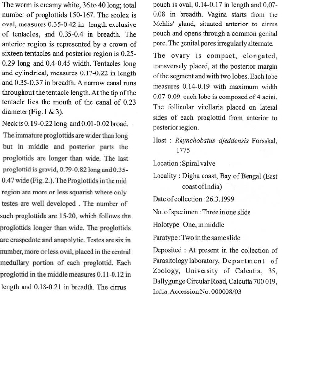 | Type Material | Parasitology Laboratory, Dpt of Zoology, University of Calcutta No. 000008/03 (1 holotype, 2 paratypes) |