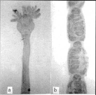 Fig. 1. Polypocephalus himansui n.sp., Camera lucida drawings; a-scolex, b-mature proglottid