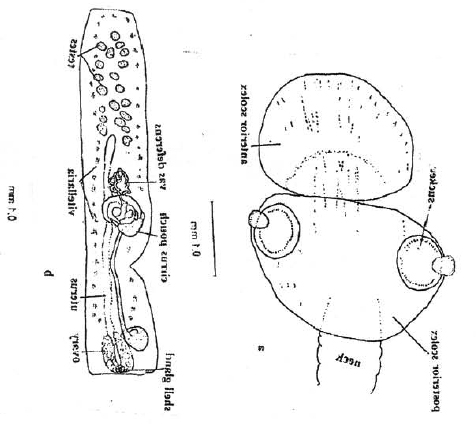 Fig. 2 Tylocephalum haldari n. sp. camera lucida drawing; (a) Scolex, (b) mature proglottid