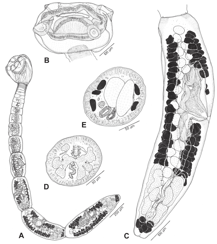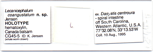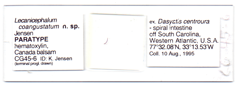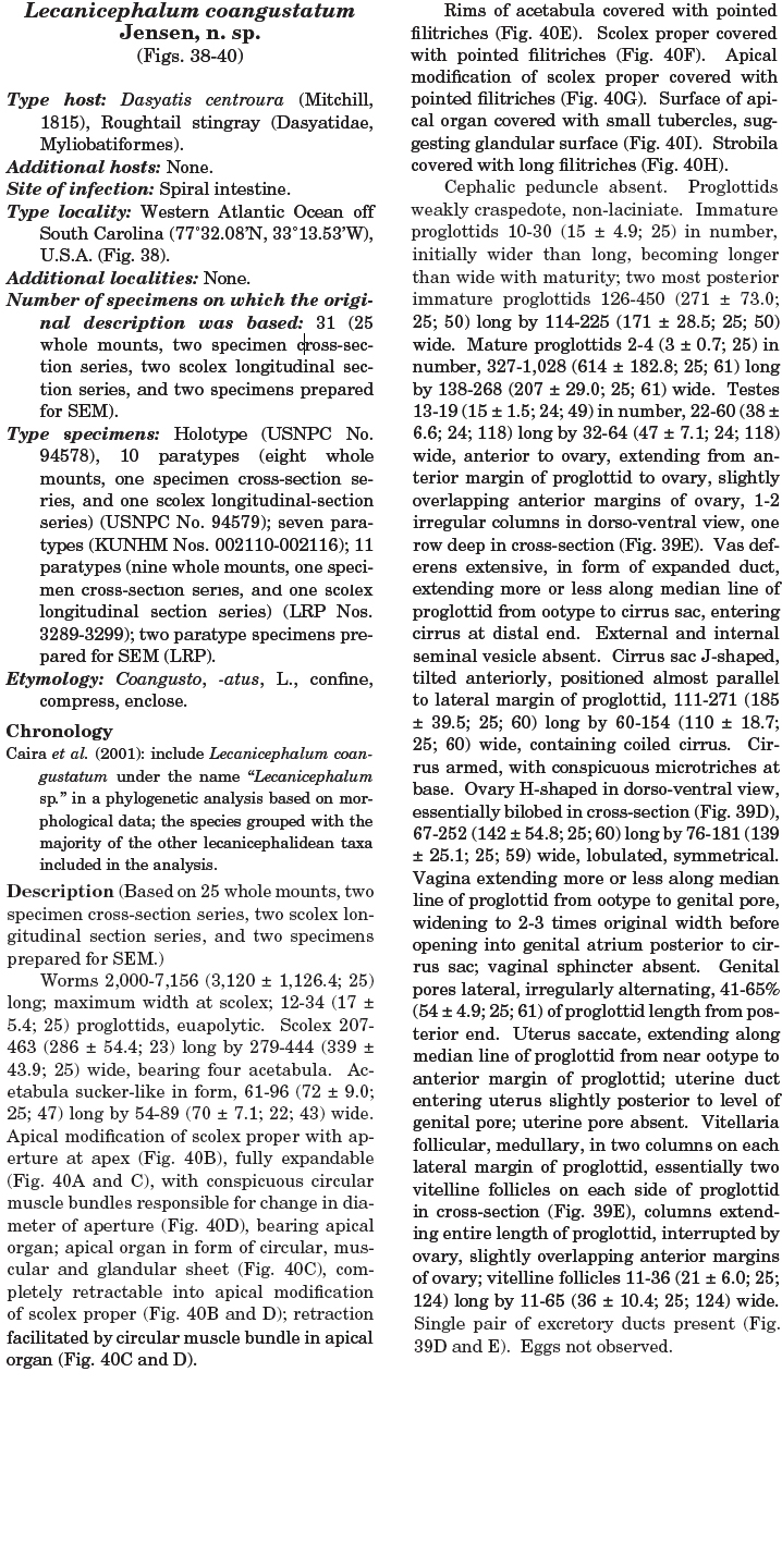 | Type Material | Holotype (USNPC No. 94578); 10 paratypes (8 whole mounts, 1 specimen cross-section series and 1 scolex longitudinal section series) (USNPC No. 94579); 7 paratypes (KUNHM Nos. 002110-002116); 11 paratypes (9 whole mounts, 1 specimen cross-section series and 1 scolex longitudinal section series) (LRP Nos. 3289-3299); 2 paratype specimens prepared for SEM (LRP) |