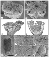 Fig. 40. A-I. Scanning electron micrographs and histological sections of Lecanicephalum coangustatum Jensen, n. sp. A. Scolex with apical organ protruded. B. Scolex with apical organ retracted. C. Longitudinal section through scolex with apical organ protruded (LRP No. 3299). D. Longitudinal section through scolex with apical organ retracted (USNPC No. 94579). E. Acetabulum. F. Microtriches on surface of scolex proper. G. Microtriches on rim of acetabulum. H. Microtriches on surface of strobila. I. Surface of apical organ. Scale bars: A and B, 50 µm; C, 10 µm; D-G, 1 µm.