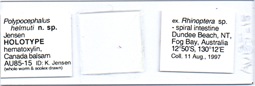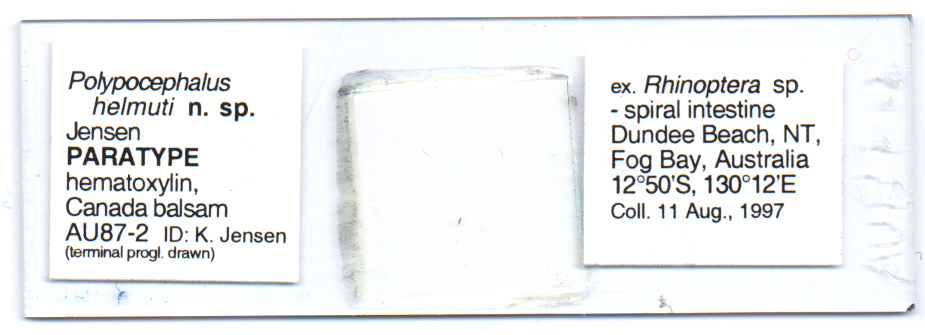 | Total Number of Type Specimens | 41 (20 whole mounts, 3 specimen cross-section series, 3 specimen longitudinal section series, 8 lactophenol preparations of eggs, and 7 specimens prepared for SEM) |