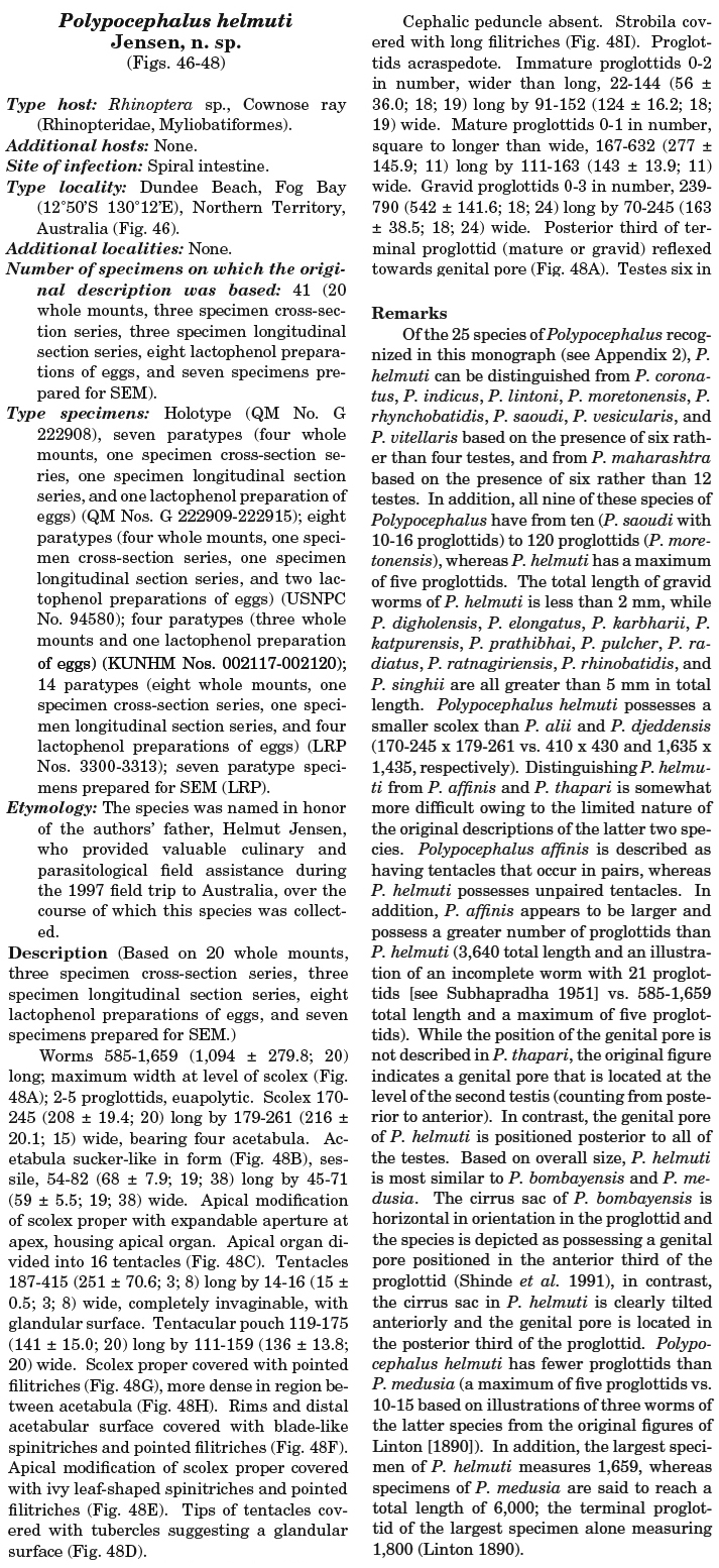 Jensen, K. 2005. Tapeworms of Elasmobranchs (Part I). A monograph on the Lecanicephalidea (Platyhelminthes, Cestoda). Bulletin of the University of Nebraska State Museum 18: 1-241. (4502) Download PDF |