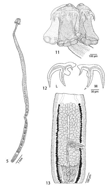 From Caira & Jensen, 2009 (Cit# 4430). FIGURE 5. Line drawings of whole worm. (5) Triloculatum triloculatum (Linton, 1901) n. comb. ex Carcharhinus obscurus. FIGURES 11–13. Triloculatum triloculatum (Linton, 1901) n. comb. (11) Scolex. (12) Hooks. (13) Terminal proglottid.