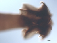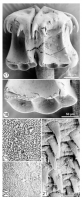 From Caira & Jensen, 2009 (Cit# 4430). FIGURES 17–21. Scanning electron micrographs of Triloculatum triloculatum (Linton, 1901) n. comb. (17) Scolex. Small numbers indicate locations of details shown in Figs. 19–21. (18) Posterior loculus divided into 3 subloculi. (19) Filitriches on distal bothridial surface. (20) Filitriches on proximal bothridial surface. (21) Spinitriches and filitriches on cephalic peduncle.