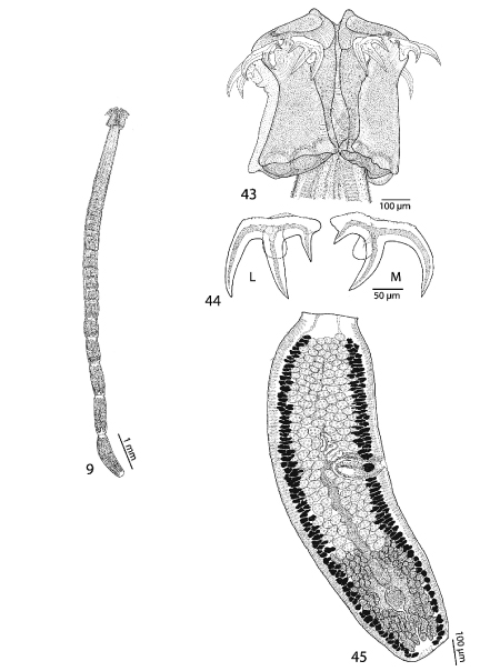 FIGURE 9. Line drawings of whole worm. (9) Triloculatum jodyi n. sp. ex Carcharhinus acronotus. FIGURES 43–45. Triloculatum jodyi n. sp. (43) Scolex. (44) Hooks. (45) Terminal proglottid.
