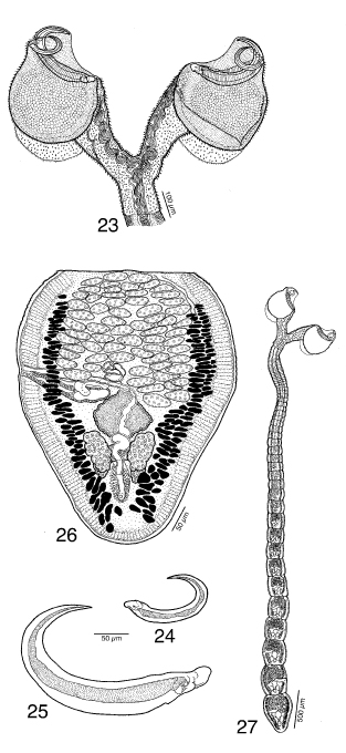 FIGURES 23–27. Line drawings of Yorkeria garneri n. sp. (23) Scolex. (24) Lateral hook. (25) Medial hook. (26) Mature proglottid, dorsal