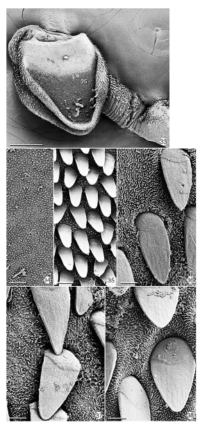 38 were taken; note that only 1 of 2 bothridial pairs is shown. (34) Distal surface of anterior region. (35) Distal surface of posthook loculus. (36)