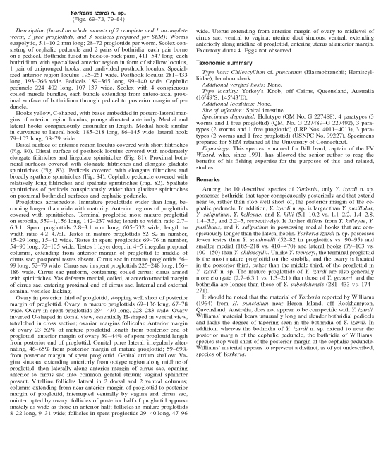 Caira, J. N., K. Jensen, and C. Rajan. 2007. Seven new Yorkeria species (Cestoda: Tetraphyllidea) from Borneo and Australia and their implications for identification of Chiloscyllium (Elasmobranchii: Orectolobiformes) species. Journal of Parasitology 93(2): 357-376.