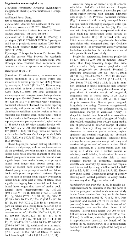 | Total Number of Type Specimens | 12 whole-mounts, cross-sections of mature proglottids of 2 of these worms and scoleces of 2 worms prepared for SEM. |