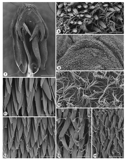 surface of posterior loculus. Scale-bars: 7, 100 µm; 8, 10–
