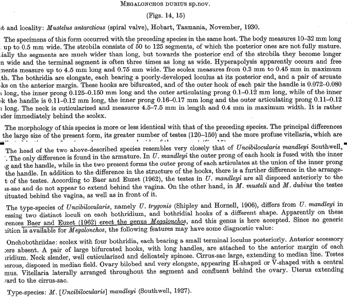 Prudhoe, S. 1969. Cestodes from fish, birds and whales. British, Australian and New Zealand Antarctic Research Expedition (BANZARE) 1929-1931, Reports - Series B (Zoology and Botany) 8(9): 171-193. (350) Download PDFCaira, J. N., F. B. Reyda and J. D. Mega. 2007. A revision of Megalonchos Baer & Euzet, 1962 (Tetraphyllidea: Onchobothriidae), with the description of two new species and transfer of two species of Biloculuncus Nasin, Caira & Euzet, 1997. Systematic Parasitology 67: 211-223. (4434) Download PDF |