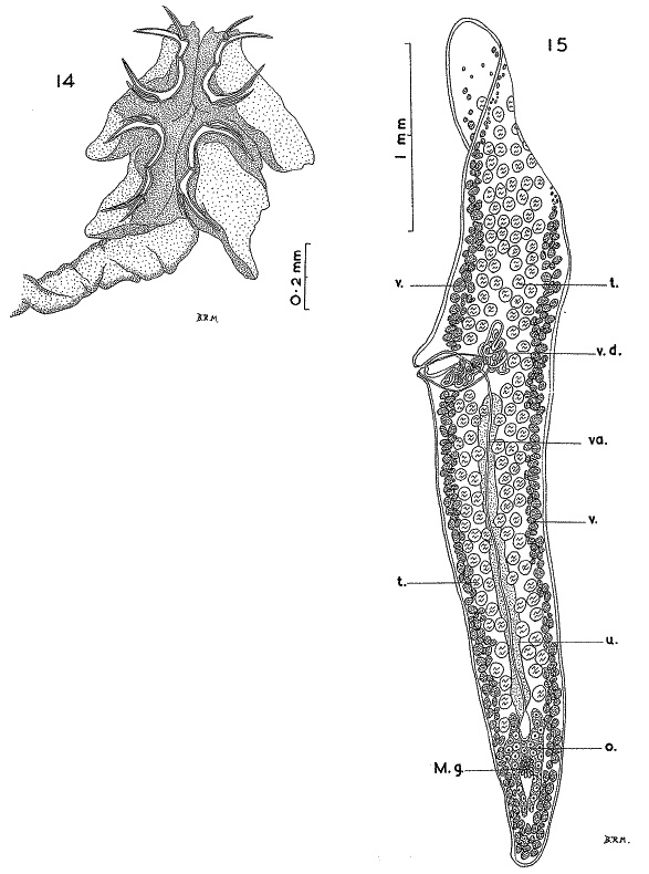 Figures 14, 15, Megalonchos dubius. 14, apical view of head; 15, free mature segment. M.g., Mehlis' gland; o., ovary; t., testes; u., uterus; v., vitellaria; va., vagina; v.d., vas deferens