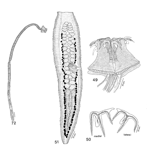 FIGURES 49–51. Phoreiobothrium perilocrocodilus n. sp. (49) Scolex. (50) Hooks. (51) Mature proglottid. (72) Phoreiobothrium perilocrocodilus n. sp. Scale bar = 200 µm