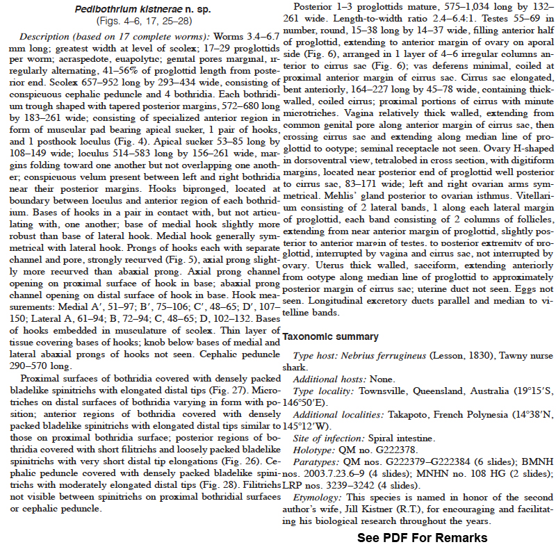 Caira, J. N., R. Tracy and L. Euzet. 2004. Five new species of Pedibothrium (Tetraphyllidea: Onchobothriidae) from the tawny nurse shark, Nebrius ferrugineus, in the Pacific Ocean. Journal of Parasitology 90(2): 286-300. (4432) Download PDF |