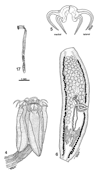 FIGURES 4–6. Pedibothrium kistnerae n. sp. 4. Scolex. 5. Hooks. 6. Mature proglottid. FIGURE 17. Whole worm