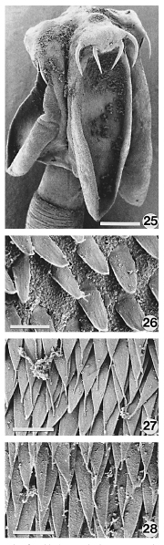 FIGURES 25–28. Scanning electron micrographs of Pedibothrium kistnerae n. sp. 25. Scolex; scale bar, 100 µm. 26. Enlarged view of distal
