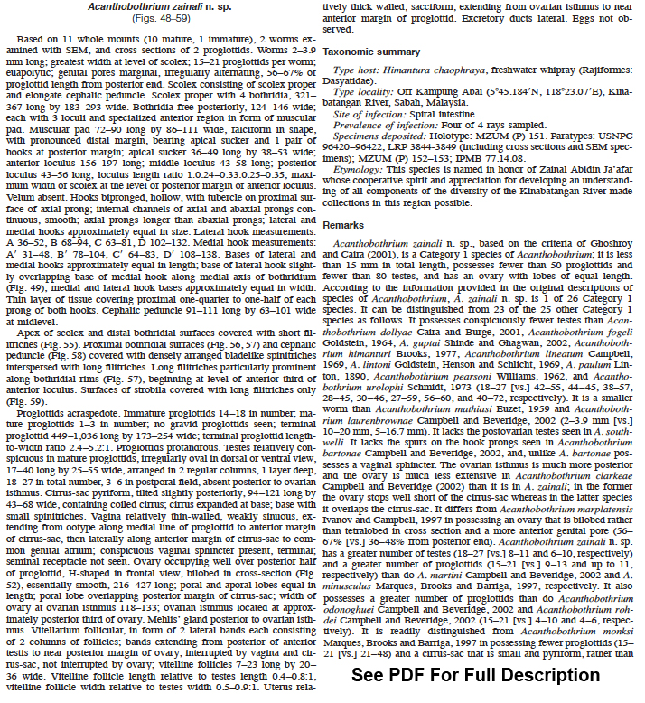 Fyler, C. and J. N. Caira. 2006. Five new species of Acanthobothrium (Tetraphyllidea: Onchobothriidae) from the freshwater stingray Himantura chaophraya (Batoidea: Dasyatidae) in Malaysian Borneo. Journal of Parasitology 92(1): 105-125. (4435) Download PDF |