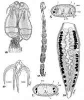 proglottid at level of testes. (52) Cross section of mature proglottid at level of ovary. (53) Whole worm. Abbreviations: DED, dorsal excretory duct; O, ovary; T, testis; U, uterus; V, vitelline follicle; VA, vagina; VD, vas deferens; VED, ventral excretory duct.