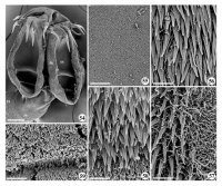 FIGURES 54–59. Scanning electron micrographs of Acanthobothrium zainali n. sp. (54) Scolex; white numbers indicate where Figs. 55–59 were taken; scale bar 50 µm. (55) Enlarged view of distal bothridial surface; scale bar, 2 µm. (56) Enlarged view of proximal bothridial surface; scale bar, 2 µm. (57) Enlarged view of bothridial surface at medial margin of bothridium; scale bar, 2 µm. (58) Enlarged view of cephalic