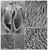 Figures 9–13. Scanning electron micrographs of Calliobothrium schneiderae n. sp. 9. Scolex; numbers indicate areas detailed by Figs. 10–13. 10. Microtriches on cephalic peduncle. 11. Microtriches on distal bothridial surface of anterior loculus. 12. Microtriches on distal surface of middle loculus. 13. Microtriches on proximal surface of bothridium.