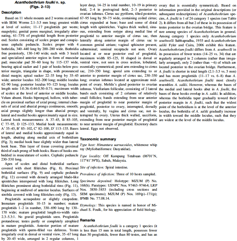 Reyda, F. B. and J. N. Caira. 2006. Five new species of Acanthobothrium (Cestoda: Tetraphyllidea) from Himantura uarnacoides (Myliobatiformes: Dasyatidae) in Malaysian Borneo. Comparative Parasitology 73(1): 49-71. (4445) Download PDF |