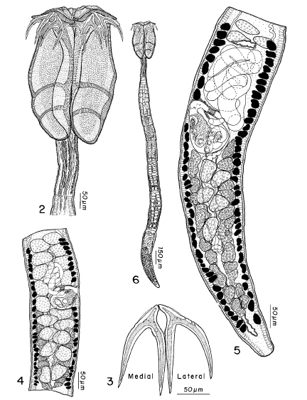 Figures 2–6. Acanthobothrium foulki n. sp. 2. Scolex. 3. Hooks. 4. Subterminal mature proglottid. 5. Terminal proglottid. 6. Whole worm.