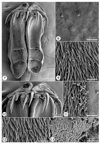 Figures 7–13. Scanning electron micrographs of Acanthobothrium foulki n. sp. 7. Scolex. 8. Microtriches on distal bothridial surface. 9. Microtriches on proximal bothridial surface. 10. Detail of hooks and apical pad. 11. Microtriches on lateral margin of left bothridium in Figure 7. 12. Microtriches on cephalic peduncle. 13. Microtriches on strobila.