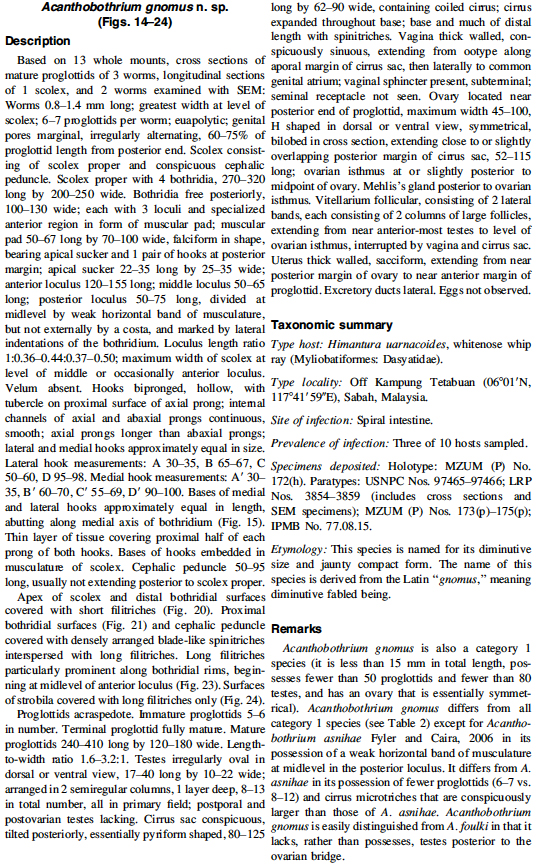 | Total Number of Type Specimens | 13 whole mounts, cross sections of mature proglottids of 3 worms, longitudinal sections of 1 scolex, and 2 worms examined with SEM |