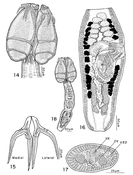 Figures 14–18. Acanthobothrium gnomus n. sp. 14. Scolex. 15. Hooks. 16. Terminal proglottid. 17. Cross section through ovary. 18. Whole worm. (OV, ovary; VED, ventral excretory duct.)