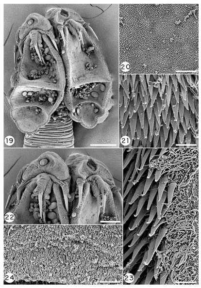 Figures 19–24. Scanning electron micrographs of Acanthobothrium gnomus n. sp. 19. Scolex. 20. Microtriches on distal bothridial surface. 21. Microtriches on proximal bothridial surface. 22. Detail of hooks and apical pad. 23. Microtriches