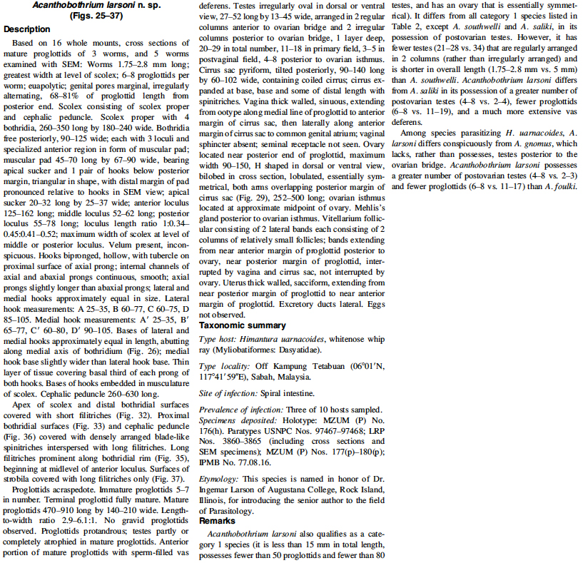 | Total Number of Type Specimens | 16 whole mounts, cross sections of mature proglottids of 3 worms, and 5 worms examined with SEM |