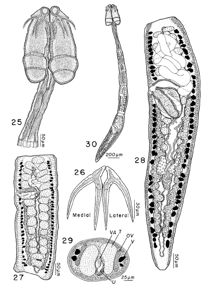Figures 25–30. Acanthobothrium larsoni n. sp. 25. Scolex. 26. Hooks. 27. Subterminal mature proglottid. 28. Terminal proglottid. 29. Cross section through ovary. 30. Whole worm. (OV, ovary; T, testis; U, uterus; V, vitelline follicle.)