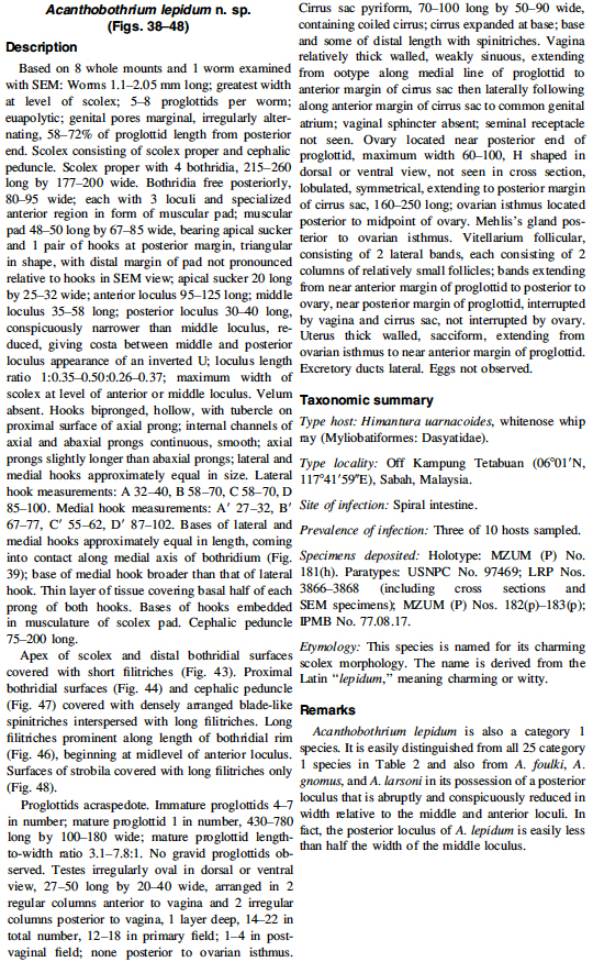 Reyda, F. B. and J. N. Caira. 2006. Five new species of Acanthobothrium (Cestoda: Tetraphyllidea) from Himantura uarnacoides (Myliobatiformes: Dasyatidae) in Malaysian Borneo. Comparative Parasitology 73(1): 49-71. (4445) Download PDF |