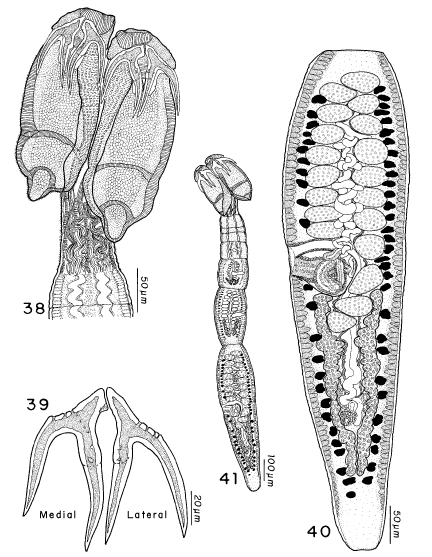 Figures 38–41. Acanthobothrium lepidum n. sp. 38. Scolex. 39. Hooks. 40. Terminal proglottid. 41. Whole worm.