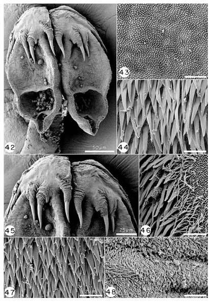 Figures 42–48. Scanning electron micrographs of Acanthobothrium lepidum n. sp. 42. Scolex. 43. Microtriches on distal bothridial surface. 44. Microtriches on proximal bothridial surface. 45. Detail of hooks and apical pad. 46. Microtriches on lateral margin of left bothridium in Figure 42. 47. Microtriches on cephalic peduncle. 48. Microtriches on strobila.