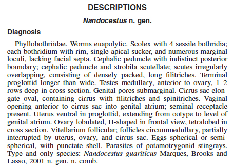 Reyda, F. B. 2008. Intestinal helminths of freshwater stingrays in southeastern Peru, and a new genus and two new species of cestode. Journal of Parasitology 94(3): 684-699.