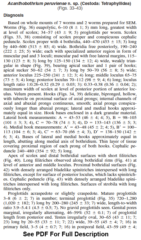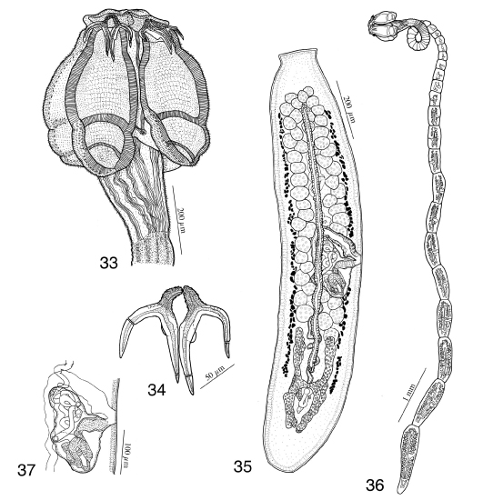 FIGURES 33–37. Line drawings of Acanthobothrium peruviense n. sp. (33) Scolex. (34) Lateral and medial hooks. (35) Terminal mature proglottid with sperm filled vas deferens. (36) Whole worm. (37) Terminal genitalia of mature proglottid with sperm filled vas deferens.