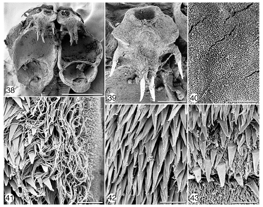 FIGURES 38–43. Scanning electron micrographs of scolex of Acanthobothrium peruviense n. sp. (38) Scolex. (39) Muscular pad and hooks. (40) Enlarged view of distal bothridial surface of middle loculus. (41) Enlarged view of rim of bothridium. (42) Enlarged view of proximal bothridial surface near bothridial rim. (43) Enlarged view of junction between cephalic peduncle and strobila. Scale bars: Fig. 38 = 200 µm; Fig.