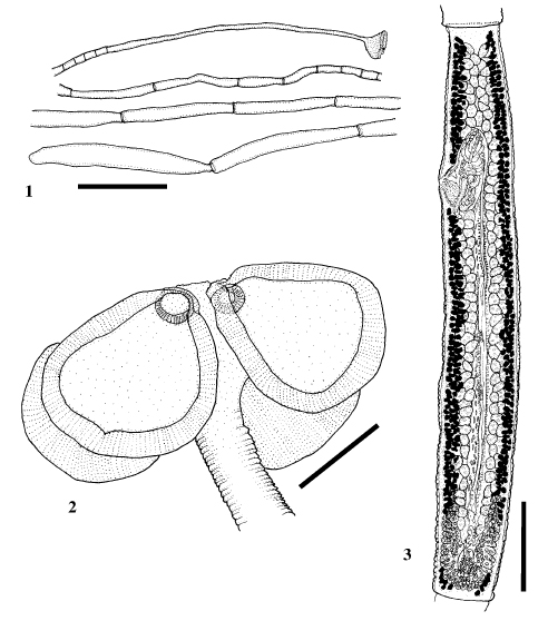 Figs.1–3 Line drawings of Paraorygmatobothrium bai n. sp. 1. Paratype (LRP 4183). 2. Scolex of paratype (LRP 4181). 3. Mature proglottid of holotype (MNHN HEL 52). Scale-bars: 1, 2 mm; 2, 200 µm; 3, 500 µm