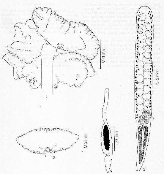 Figures 1-4. Phyllobothrium kingae sp. n. from a Jamaican stingray. 1. Scolex. 2. Bothridium. 3. Mature proglottid. 4. Gravid proglottid (bottom) attached to a nearly mature proglottid (top), showing disparity of size. The black area illustrates the gravid uterus.
