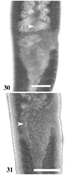 Figs. 30-31. A. michaeli n. sp. 30. Vas deferens of paratype (CNHE 6231). 31. Vagina of paratype (LRP 4234). Scale-bars: 30-31, 100 µm