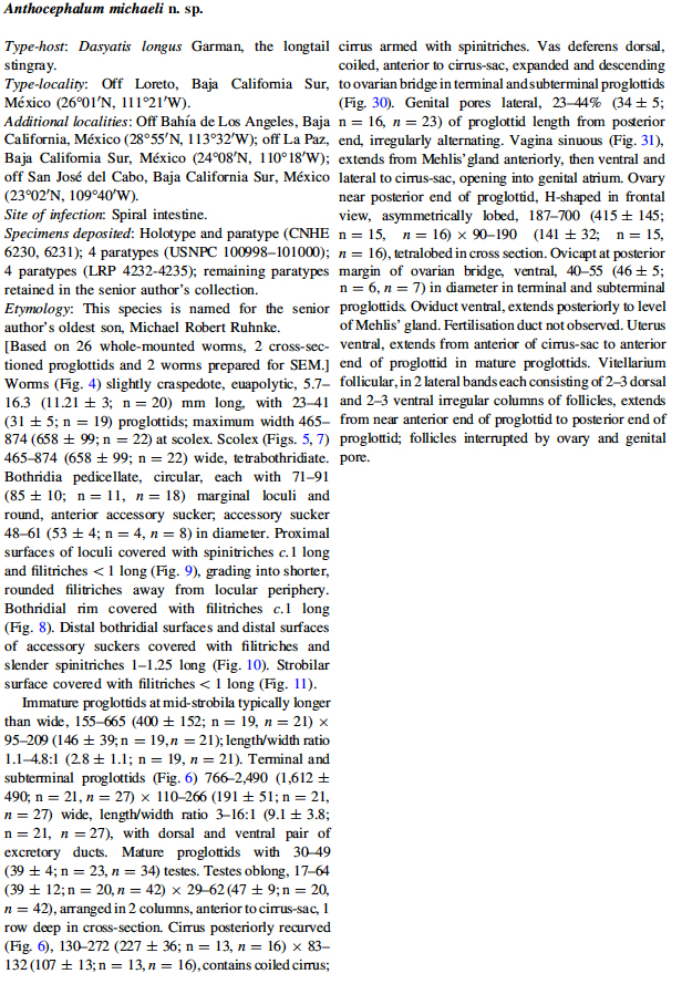 Ruhnke, T. R. and H. B. Seaman. 2009. Three new species of Anthocephalum Linton, 1890 (Cestoda: Tetraphyllidea) from dasyatid stingrays of the Gulf of California. Systematic Parasitology 72: 81-95. (4449) Download PDF |