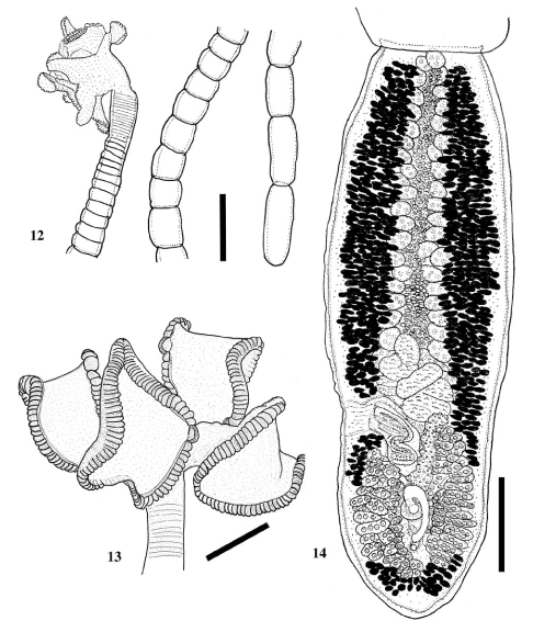 Figs. 12–14 Anthocephalum lukei n. sp. 12. Entire holotype (CNHE 6232). 13. Scolex of paratype (LRP 4238). 14. Terminal proglottid of holotype (CNHE 6232). Scale-bars: 12, 1 mm; 13-14, 200 µm