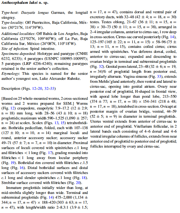 Ruhnke, T. R. and H. B. Seaman. 2009. Three new species of Anthocephalum Linton, 1890 (Cestoda: Tetraphyllidea) from dasyatid stingrays of the Gulf of California. Systematic Parasitology 72: 81-95. (4449) Download PDF |
