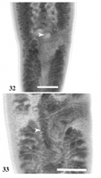 Figs. 32-33. A. lukei n. sp. 32. Vas deferens of paratype (LRP 4237). 33. Vagina of paratype (LRP 4236). Scale-bars: 32-33, 100 µm