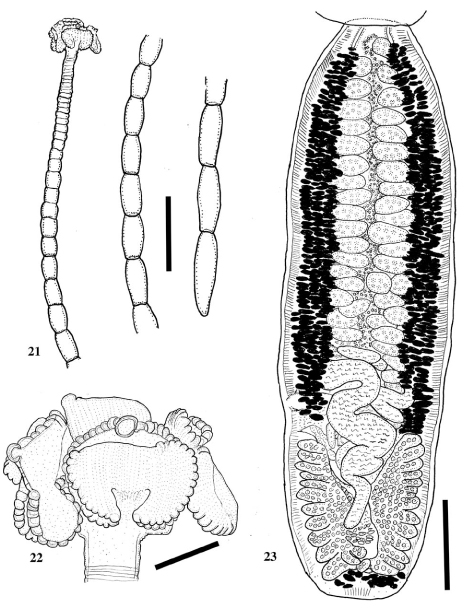 Figs. 21–23 Anthocephalum currani n. sp. 21. Entire paratype (LRP 4243). 22. Scolex of paratype (LRP 4243). 23. Terminal proglottid of holotype (CNHE 6234). Scale-bars: 21, 1 mm; 22-23, 200 µm